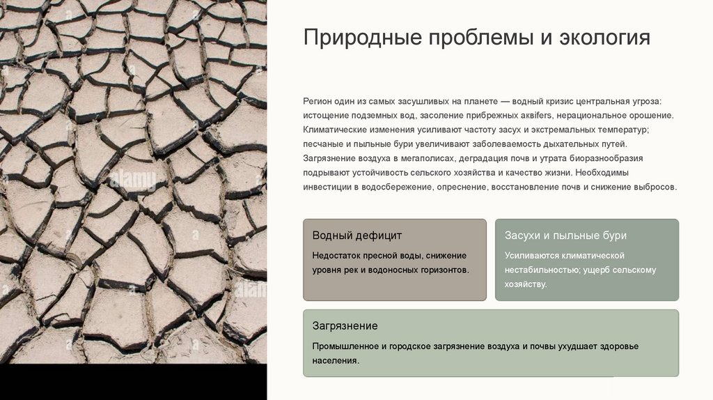 Природные проблемы и экологияРегион один из самых засушливых на планете — водный кризис центральная угроза:
