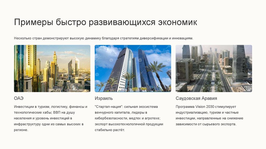 Примеры быстро развивающихся экономикНесколько стран демонстрируют высокую динамику благодаря стратегиям диверсификации и инновациям.