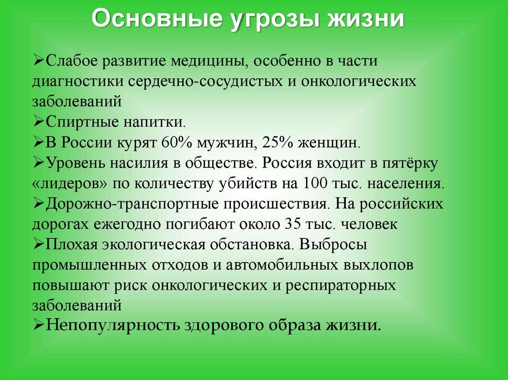 Основные угрозы жизниСлабое развитие медицины, особенно в части