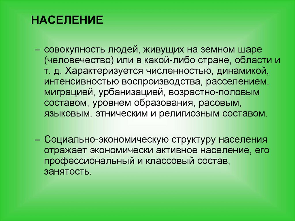 Населением считается совокупность людей ,проживающих в пределах конкретной территории.