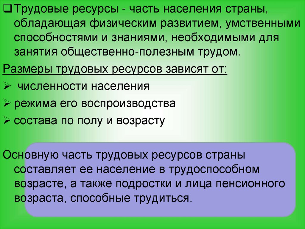 Трудовые ресурсы - часть населения страны,обладающая физическим развитием, умственными
