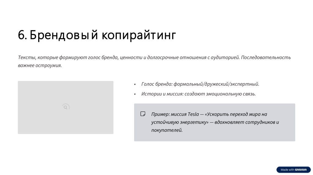 6. Брендов ы й копирайтингТексты, которые формируют голос бренда, ценности и долгосрочные отношения с аудиторией. Последовательность