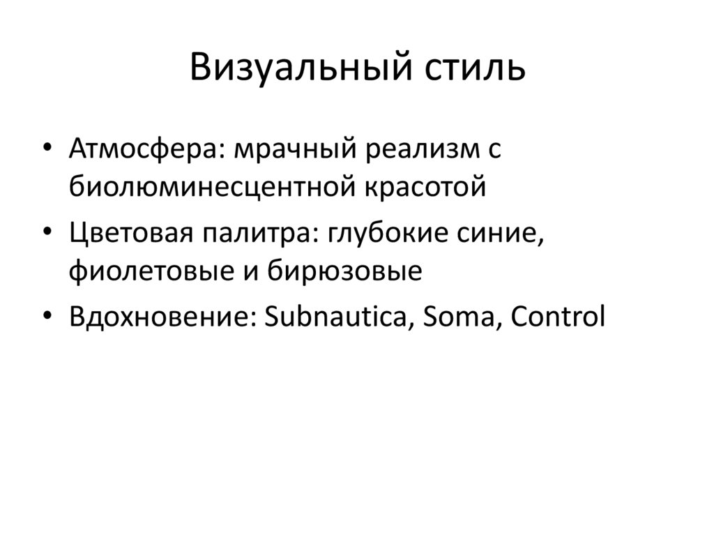 Визуальный стиль• Атмосфера: мрачный реализм с