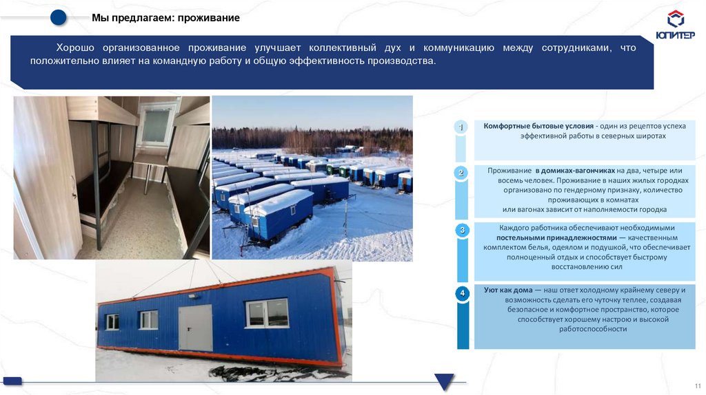Мы предлагаем: проживаниеХорошо организованное проживание улучшает коллективный дух и коммуникацию между сотрудниками, что