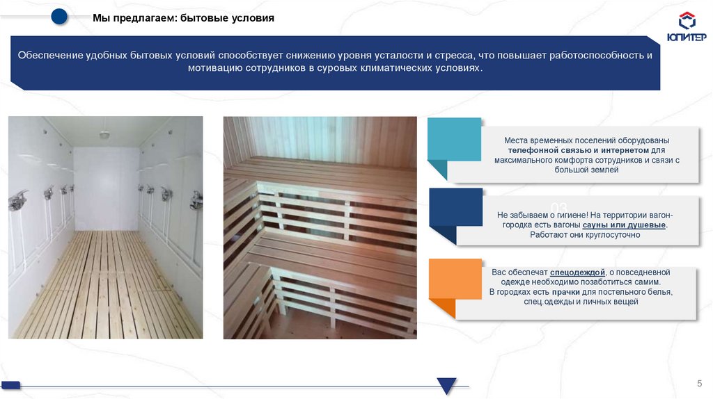 Мы предлагаем: бытовые условияОбеспечение удобных бытовых условий способствует снижению уровня усталости и стресса, что повышает работоспособность и