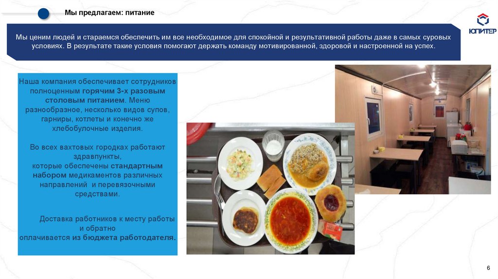 Мы предлагаем: питаниеМы ценим людей и стараемся обеспечить им все необходимое для спокойной и результативной работы даже в самых суровых