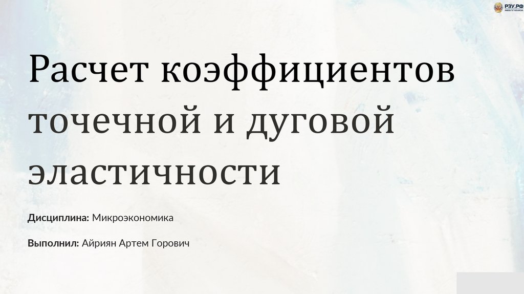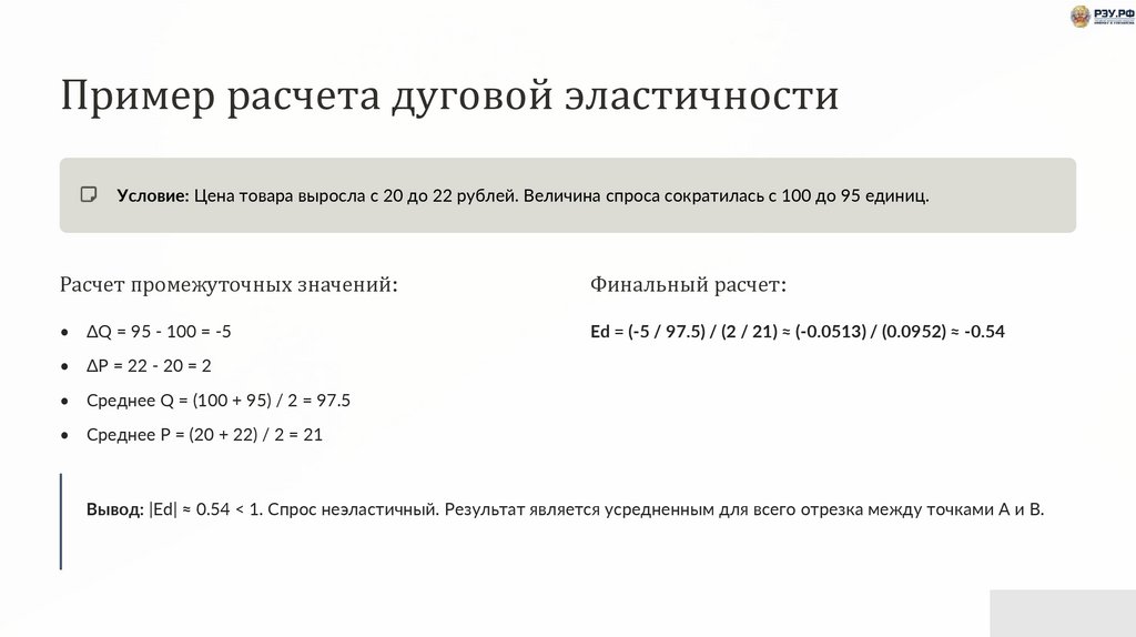 Пример расчета дуговой эластичностиУсловие: Цена товара выросла с 20 до 22 рублей. Величина спроса сократилась с 100 до 95 единиц.