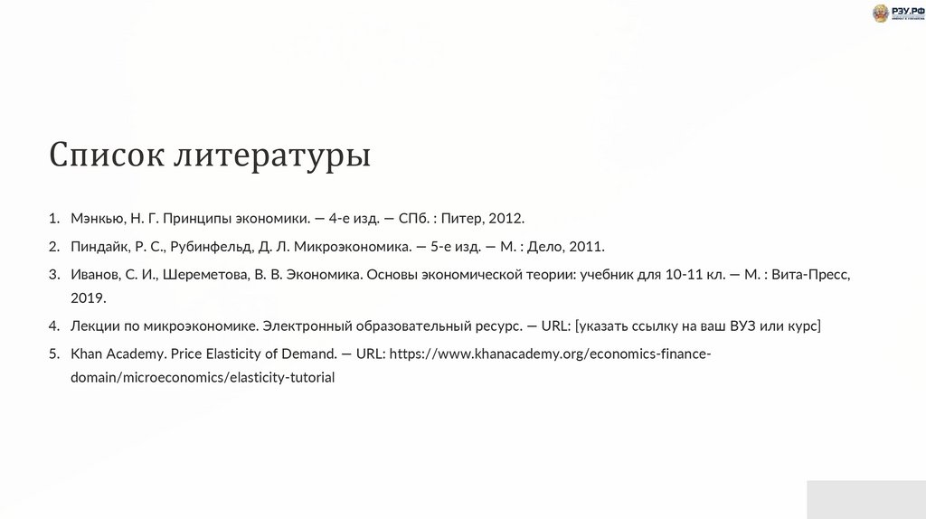 Список литературы1. Мэнкью, Н. Г. Принципы экономики. — 4-е изд. — СПб. : Питер, 2012.