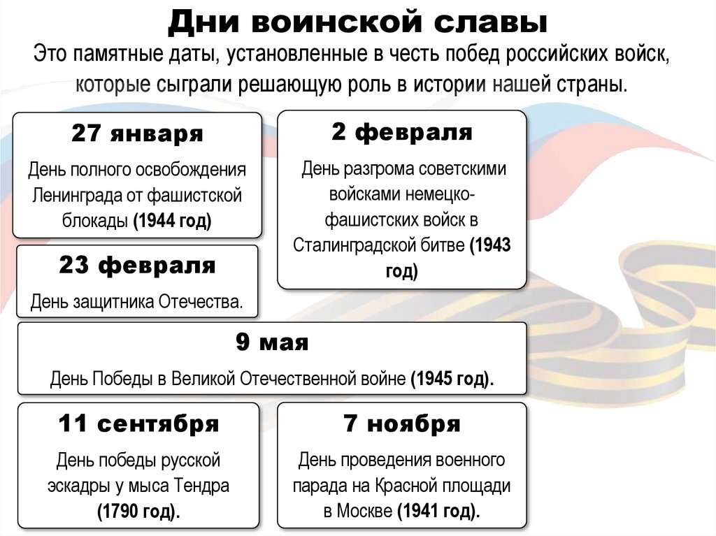 Дни воинской славыЭто памятные даты, установленные в честь побед российских войск,