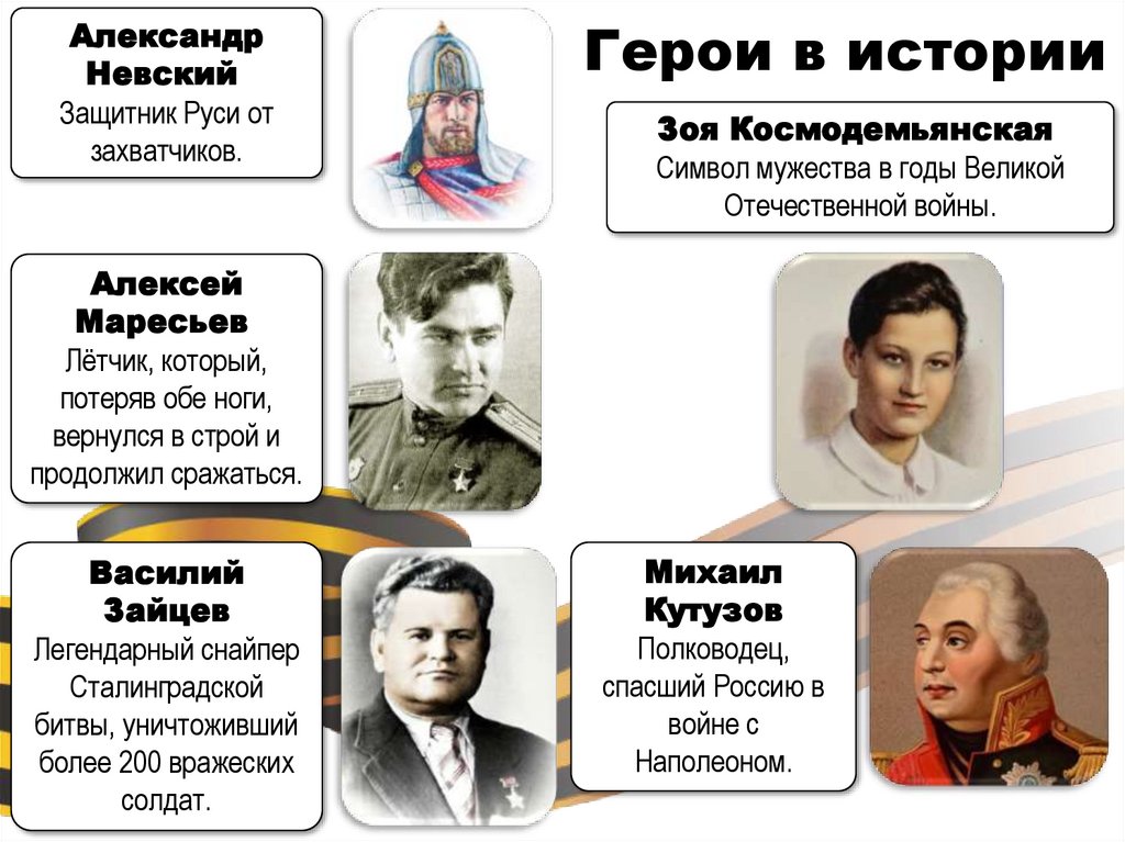 Подвиги героев, таких как Зоя Космодемьянская, Александр