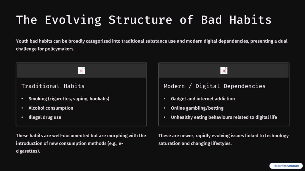 The Evolving Structure of Bad HabitsYouth bad habits can be broadly categorized into traditional substance use and modern digital dependencies, presenting a dual