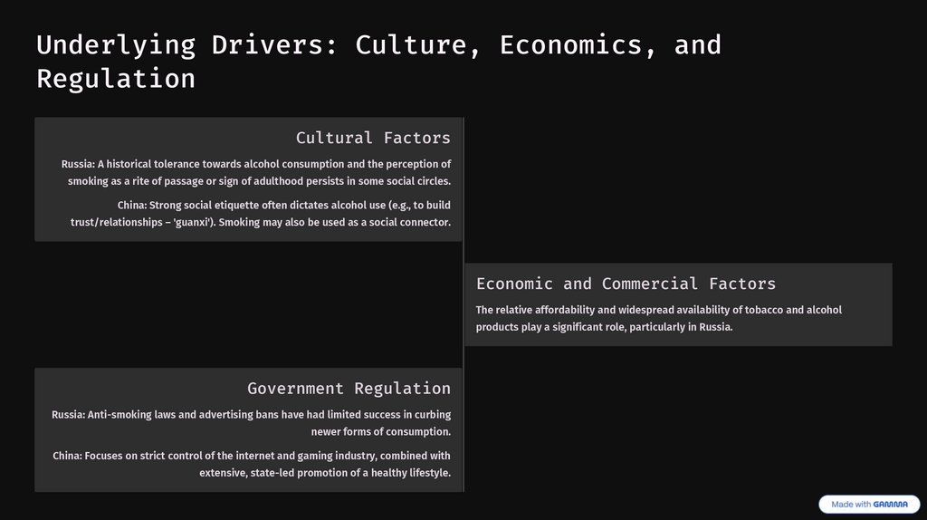 Underlying Drivers: Culture, Economics, andRegulation
