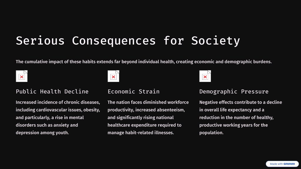 Serious Consequences for SocietyThe cumulative impact of these habits extends far beyond individual health, creating economic and demographic burdens.