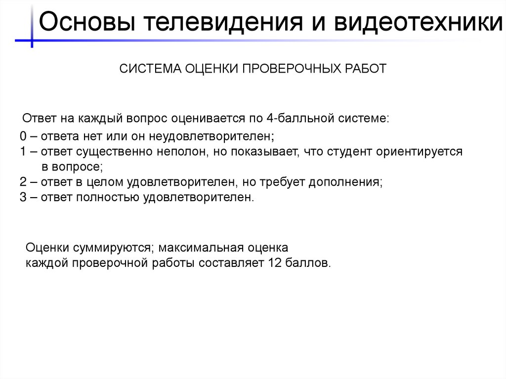 Основы телевидения и видеотехникиСИСТЕМА ОЦЕНКИ ПРОВЕРОЧНЫХ РАБОТ