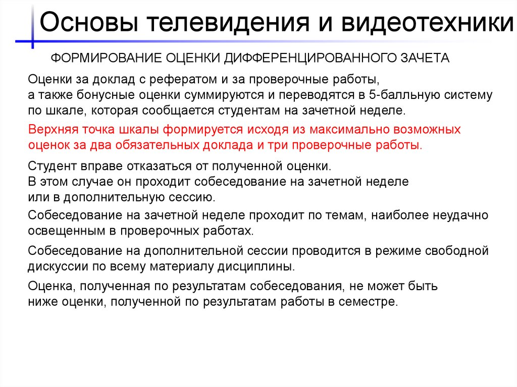 Основы телевидения и видеотехникиФОРМИРОВАНИЕ ОЦЕНКИ ДИФФЕРЕНЦИРОВАННОГО ЗАЧЕТА
