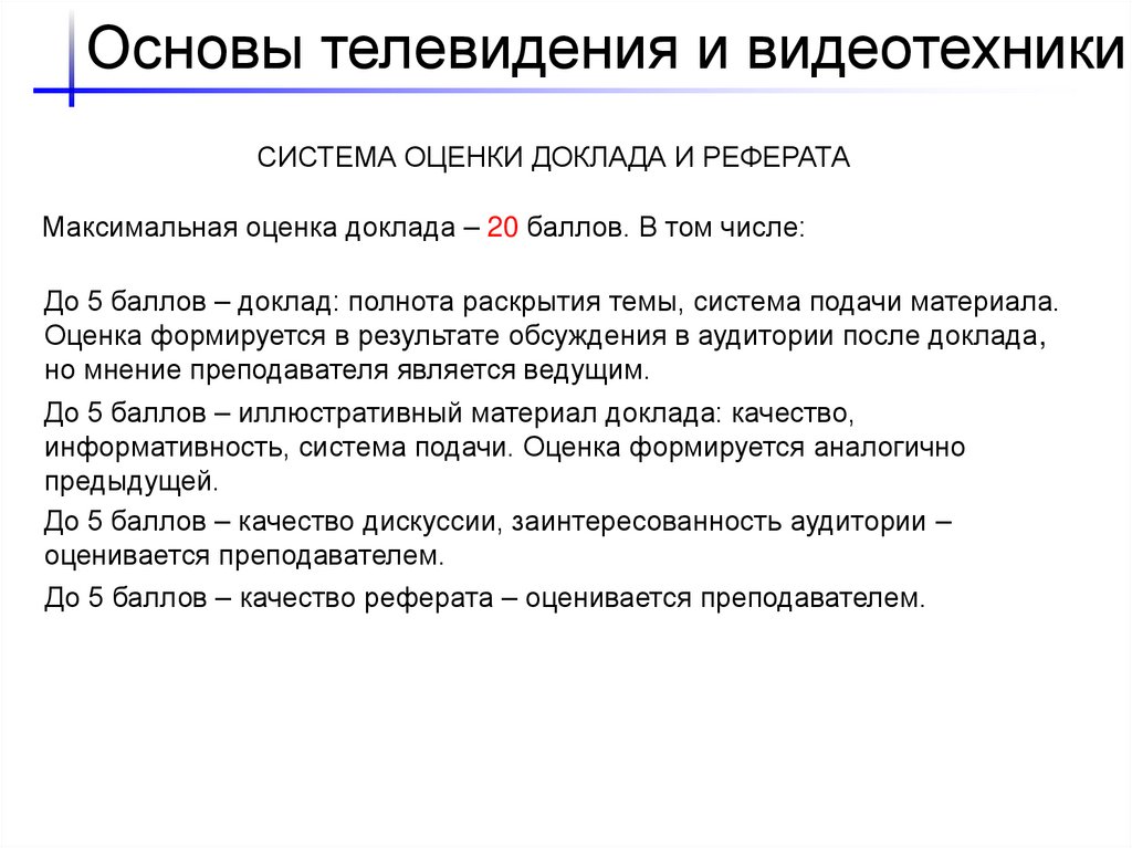 Основы телевидения и видеотехникиСИСТЕМА ОЦЕНКИ ДОКЛАДА И РЕФЕРАТА