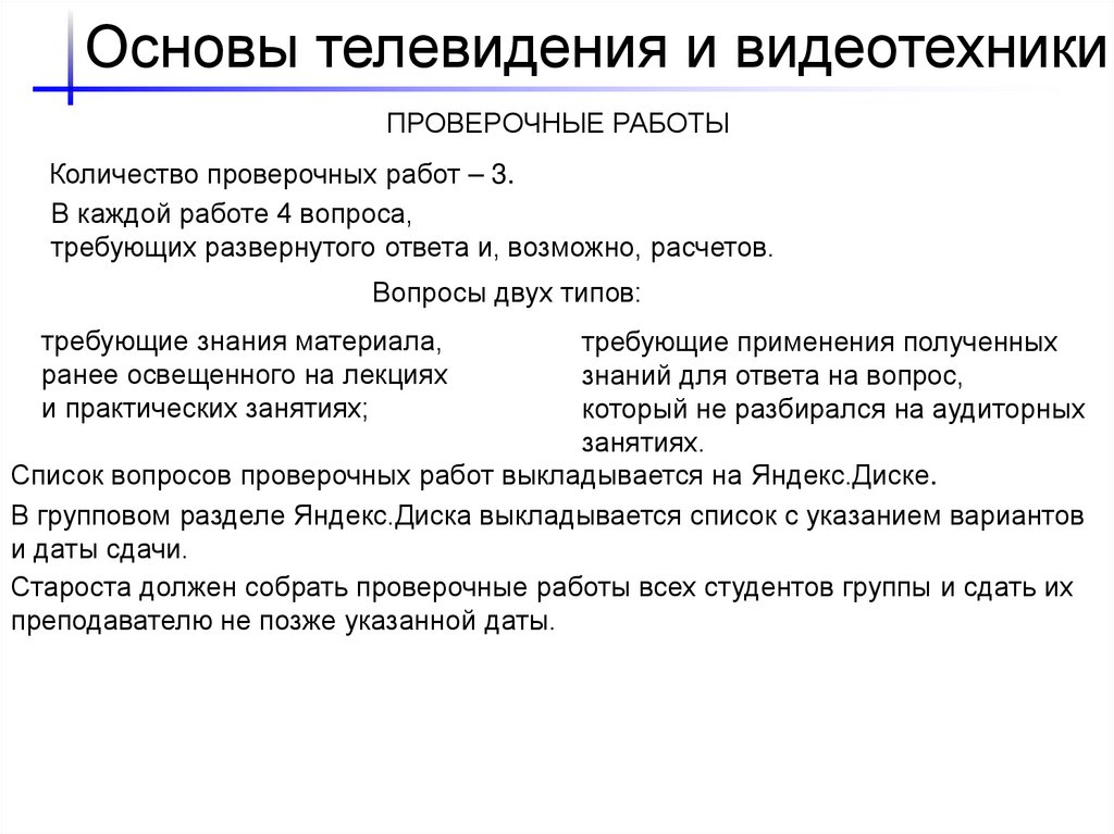 Список вопросов проверочных работ выкладывается на Яндекс.Диске.