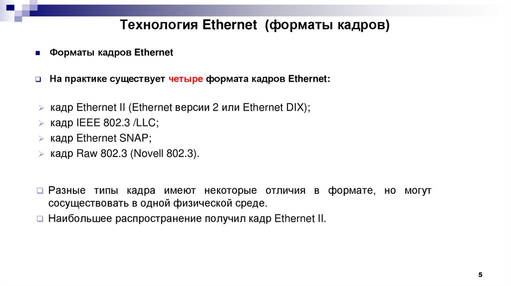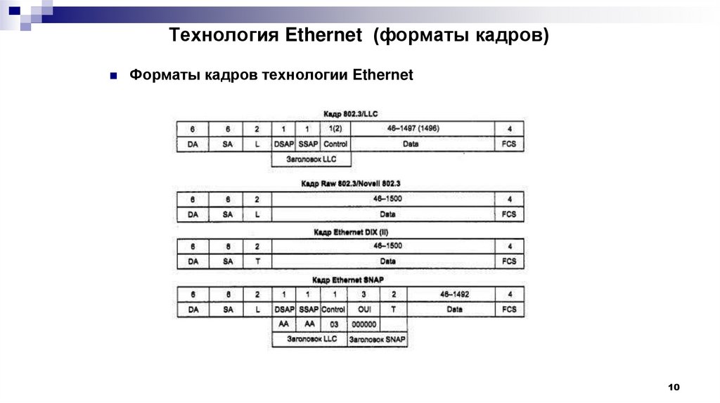 Технология Ethernet (форматы кадров)Форматы кадров Ethernet