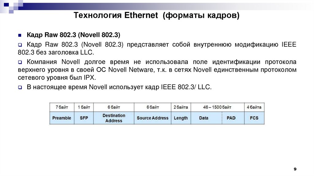 Кадр Raw 802.3 (Novell 802.3) представляет собой внутреннюю модификацию IEEE
