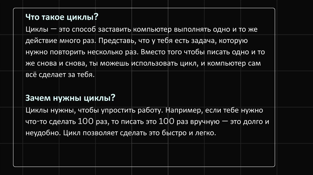 Что такое циклы?Циклы — это способ заставить компьютер выполнять одно и то же