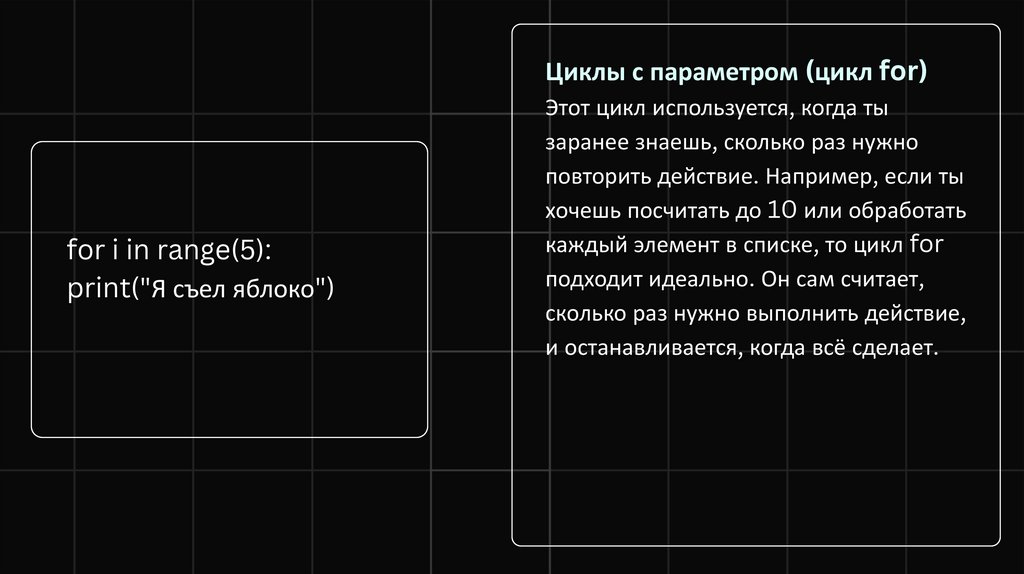 В чем разница между for и while?• Цикл for используется, когда ты знаешь, сколько раз