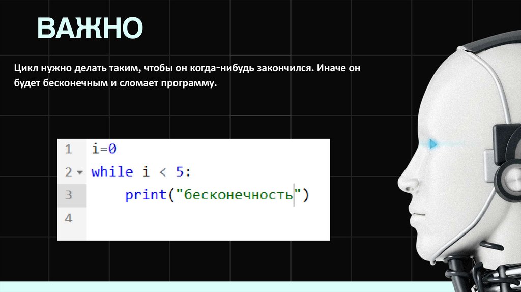 ВАЖНОЦикл нужно делать таким, чтобы он когда-нибудь закончился. Иначе он