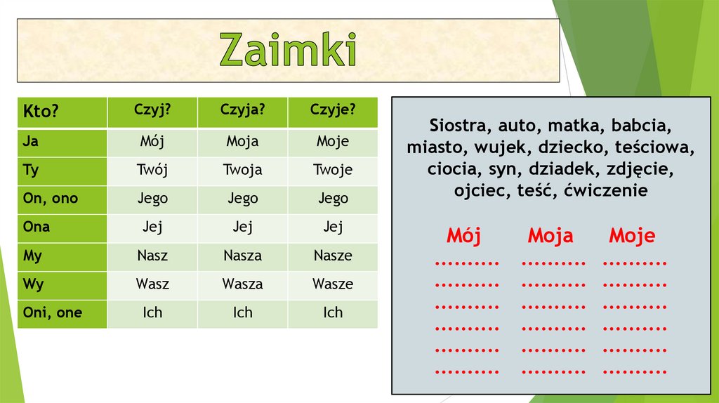Mami: Uwe, jego / moja / jej żona i twoje / ich / on dzieci są na obiedzie. A