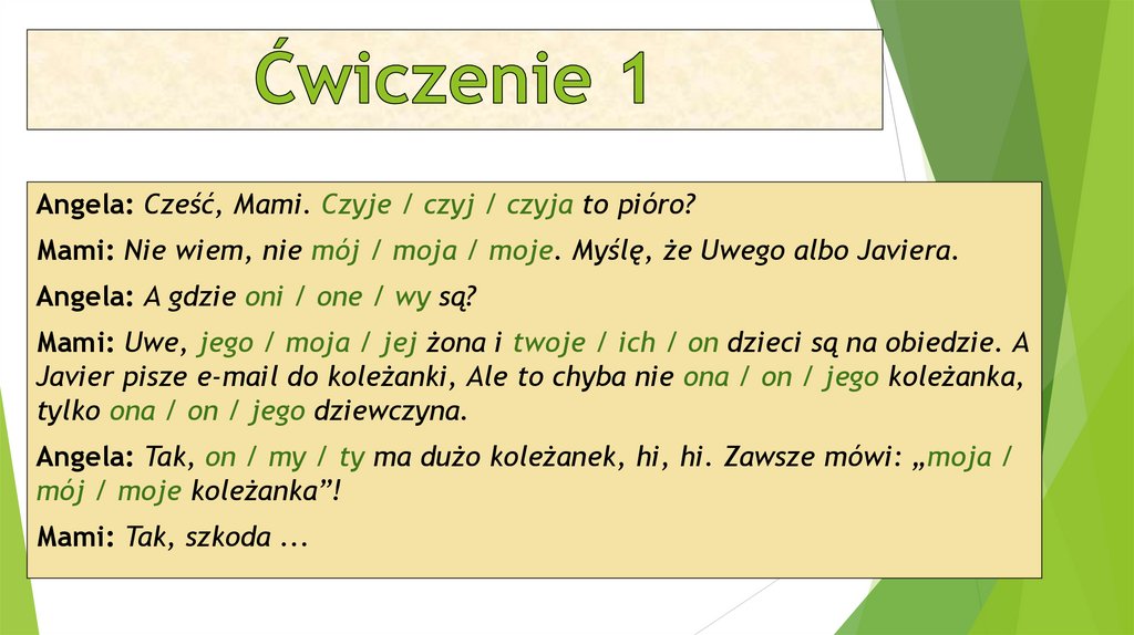 Angela: Cześć, Mami. Czyje / czyj / czyja to pióro?Mami: Nie wiem, nie mój / moja / moje. Myślę, że Uwego albo Javiera.