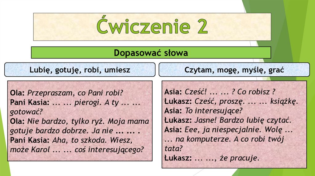 Dopasować słowaLubię, gotuję, robi, umiesz
