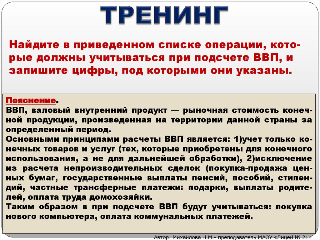 Таким образом в при подсчете ВВП будут учитываться: покупка