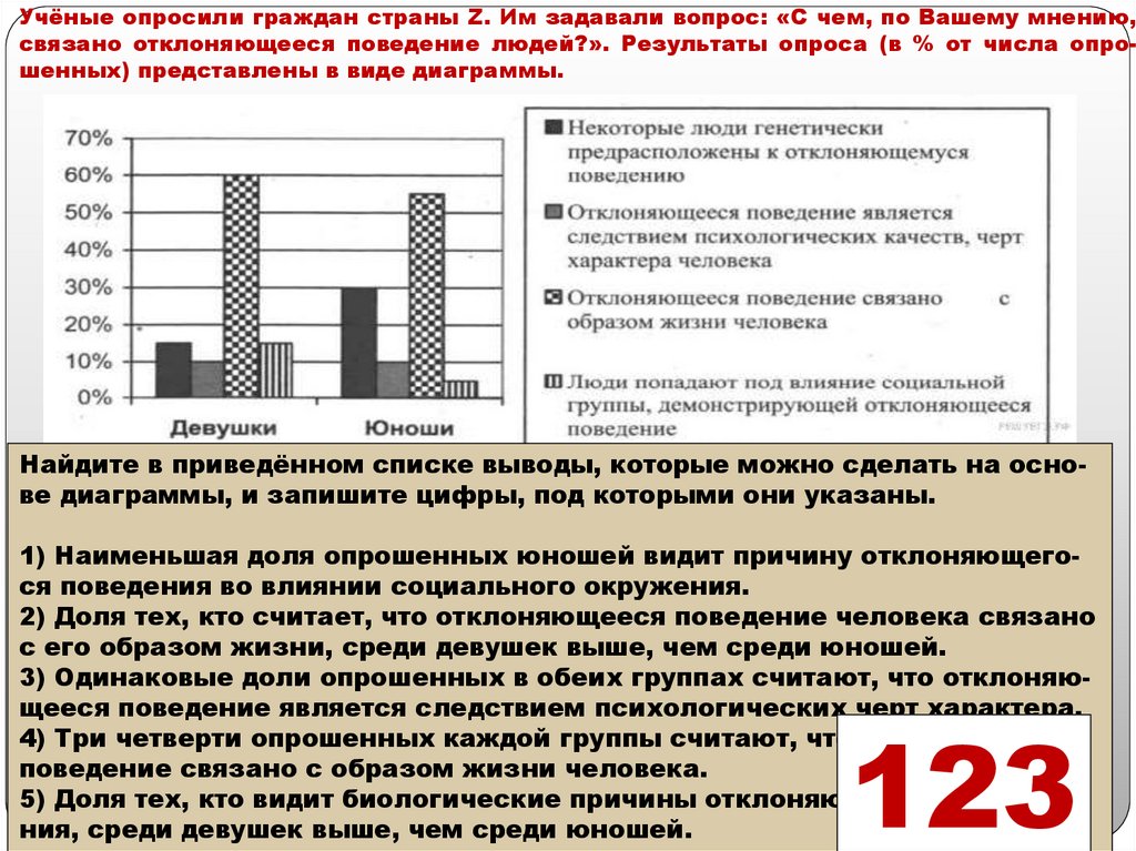 Учёные опросили граждан страны Z. Им задавали вопрос: «С чем, по Вашему мнению,связано отклоняющееся поведение людей?». Результаты опроса (в % от числа опрошенных) представлены в виде диаграммы.