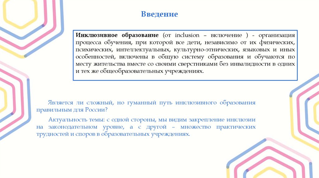Актуальность темы: с одной стороны, мы видим закрепление инклюзии