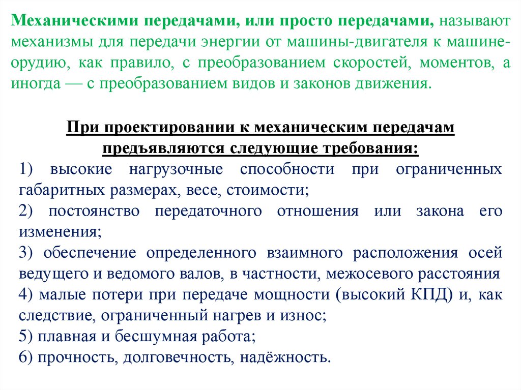 Механическими передачами, или просто передачами, называютмеханизмы для передачи энергии от машины-двигателя к машинеорудию, как правило, с преобразованием скоростей, моментов, а