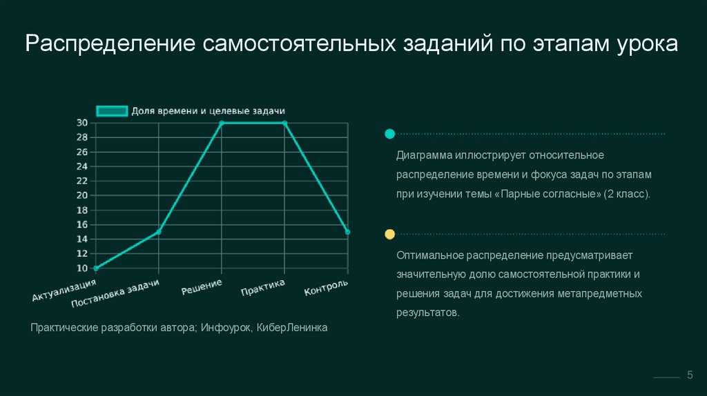 Распределение самостоятельных заданий по этапам урокаДиаграмма иллюстрирует относительное