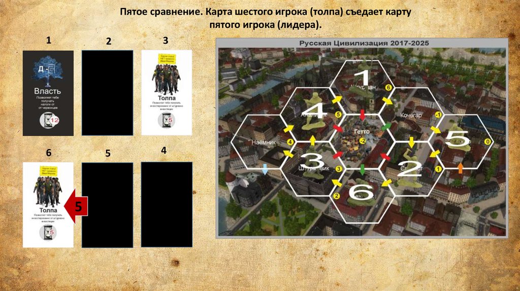 Пятое сравнение. Карта шестого игрока (толпа) съедает картупятого игрока (лидера).