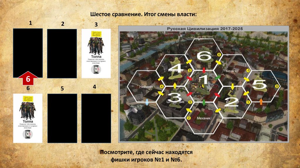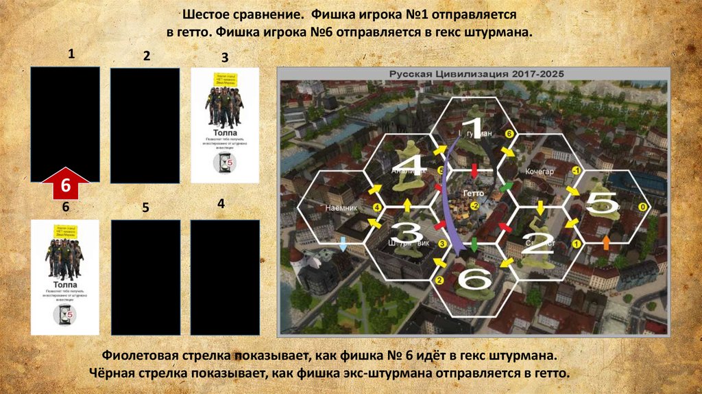 Шестое сравнение. Фишка игрока №1 отправляетсяв гетто. Фишка игрока №6 отправляется в гекс штурмана.