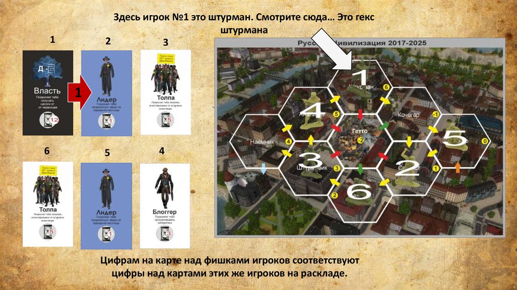 Здесь игрок №1 это штурман. Смотрите сюда… Это гексштурмана