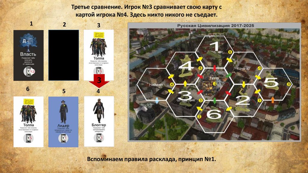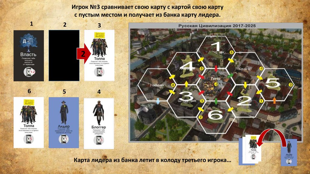 Игрок №3 сравнивает свою карту с картой свою картус пустым местом и получает из банка карту лидера.