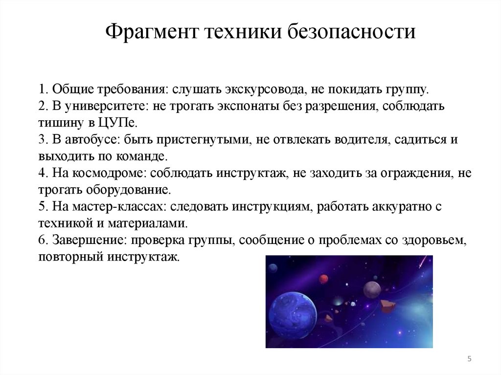 4. На космодроме: соблюдать инструктаж, не заходить за ограждения, не
