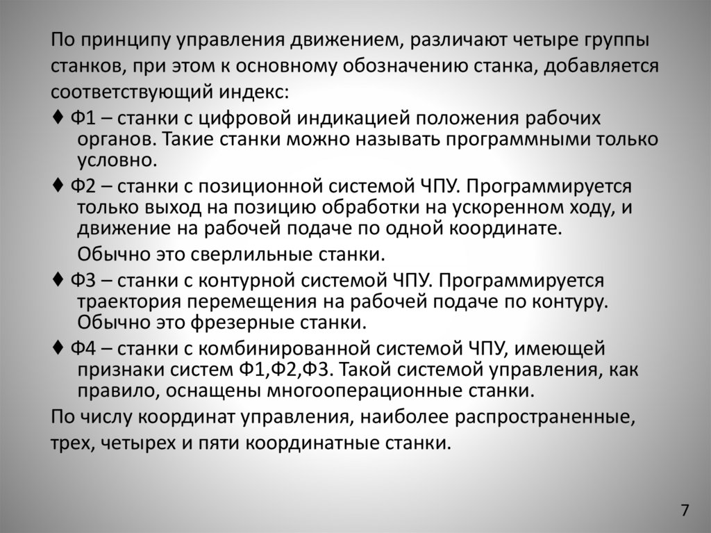 По принципу управления движением, различают четыре группыстанков, при этом к основному обозначению станка, добавляется