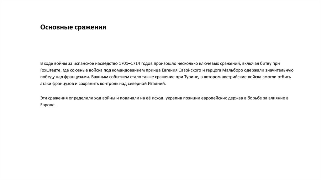 Основные сраженияВ ходе войны за испанское наследство 1701–1714 годов произошло несколько ключевых сражений, включая битву при