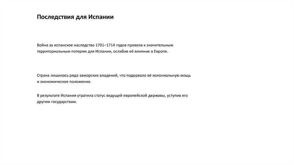 Последствия для ИспанииВойна за испанское наследство 1701–1714 годов привела к значительным