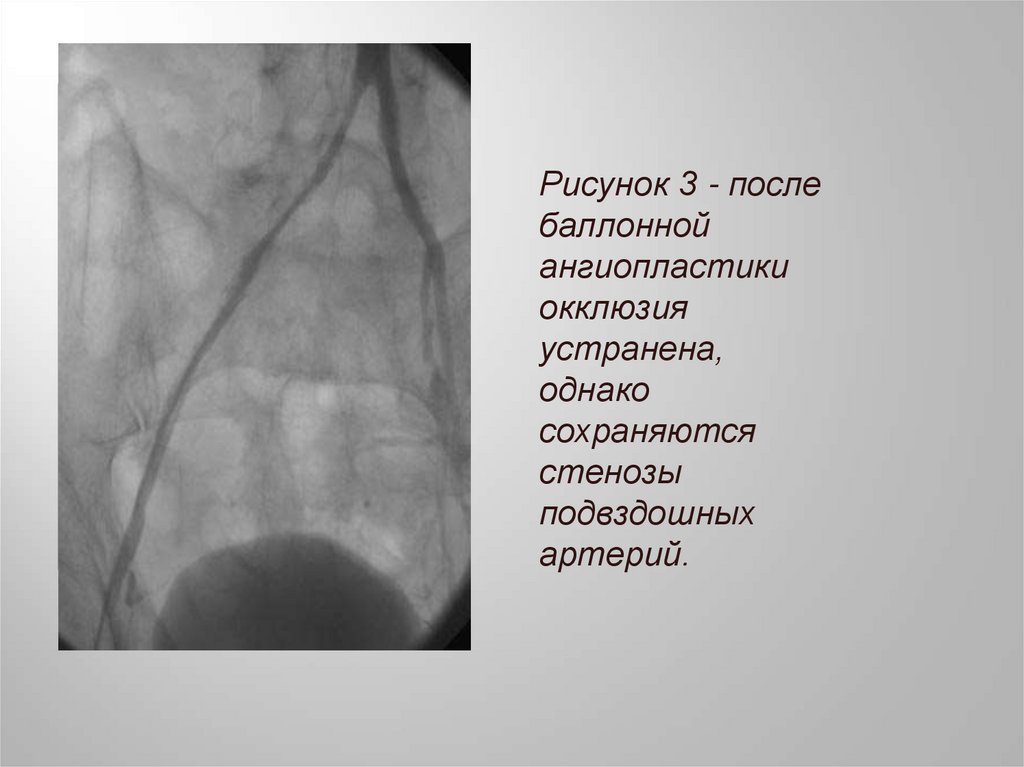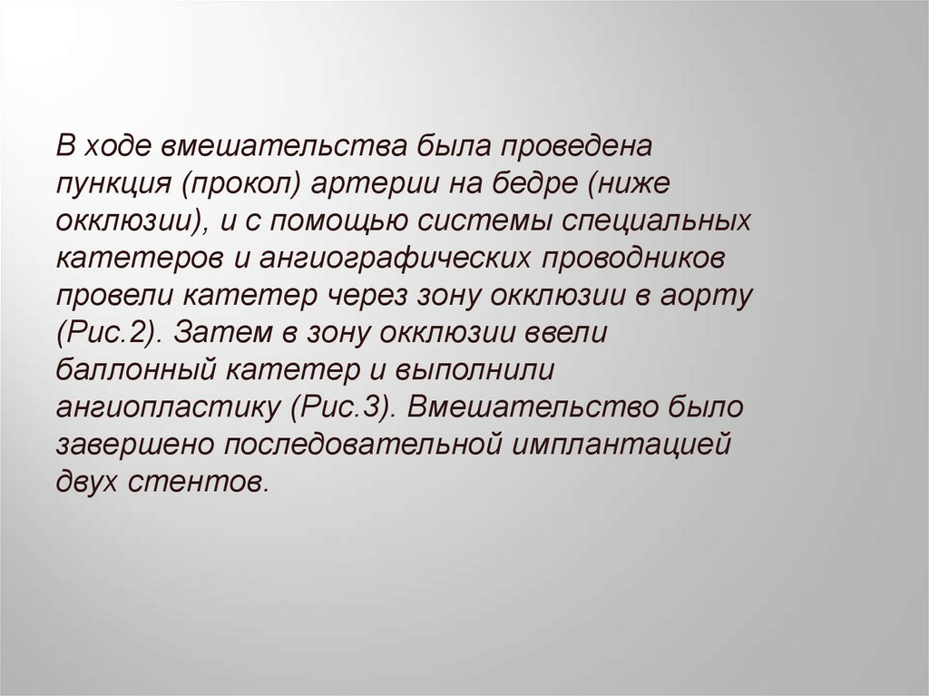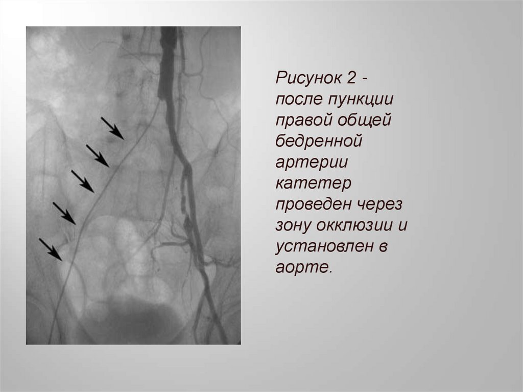 В ходе вмешательства была проведенапункция (прокол) артерии на бедре (ниже