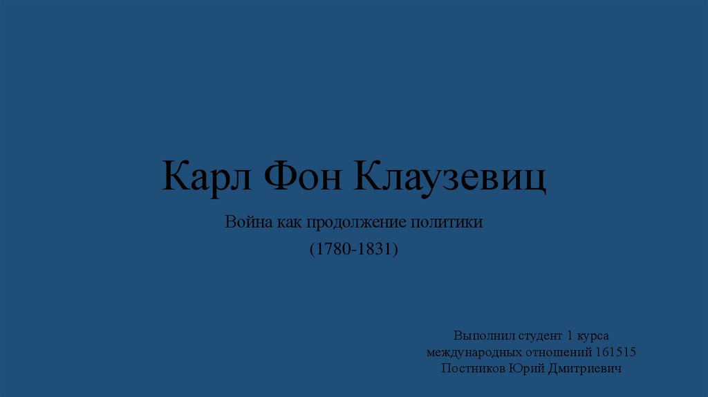Центральная идея Клаузевица:• «Война есть не что иное, как продолжение политики, с привлечением