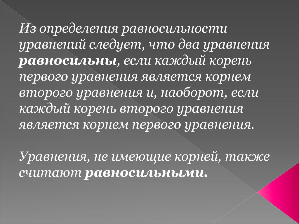 1)Если два уравнения равносильны, токаждое из них является следствием