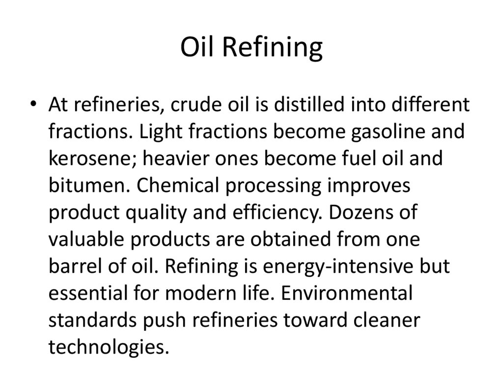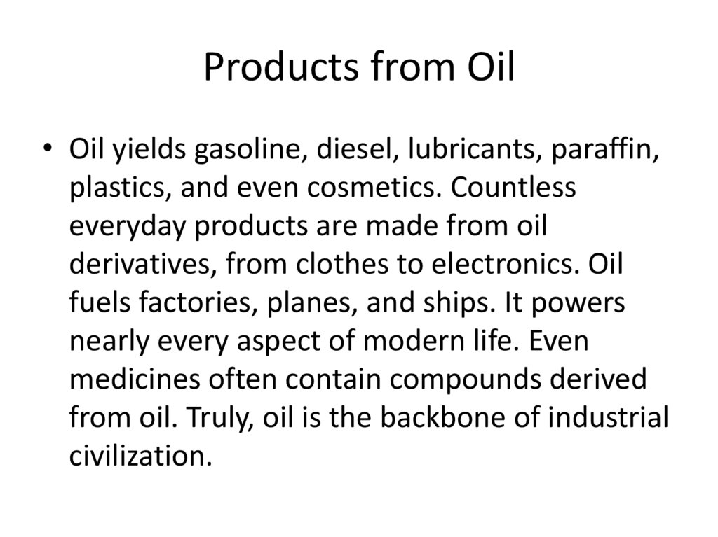 Products from Oil• Oil yields gasoline, diesel, lubricants, paraffin,