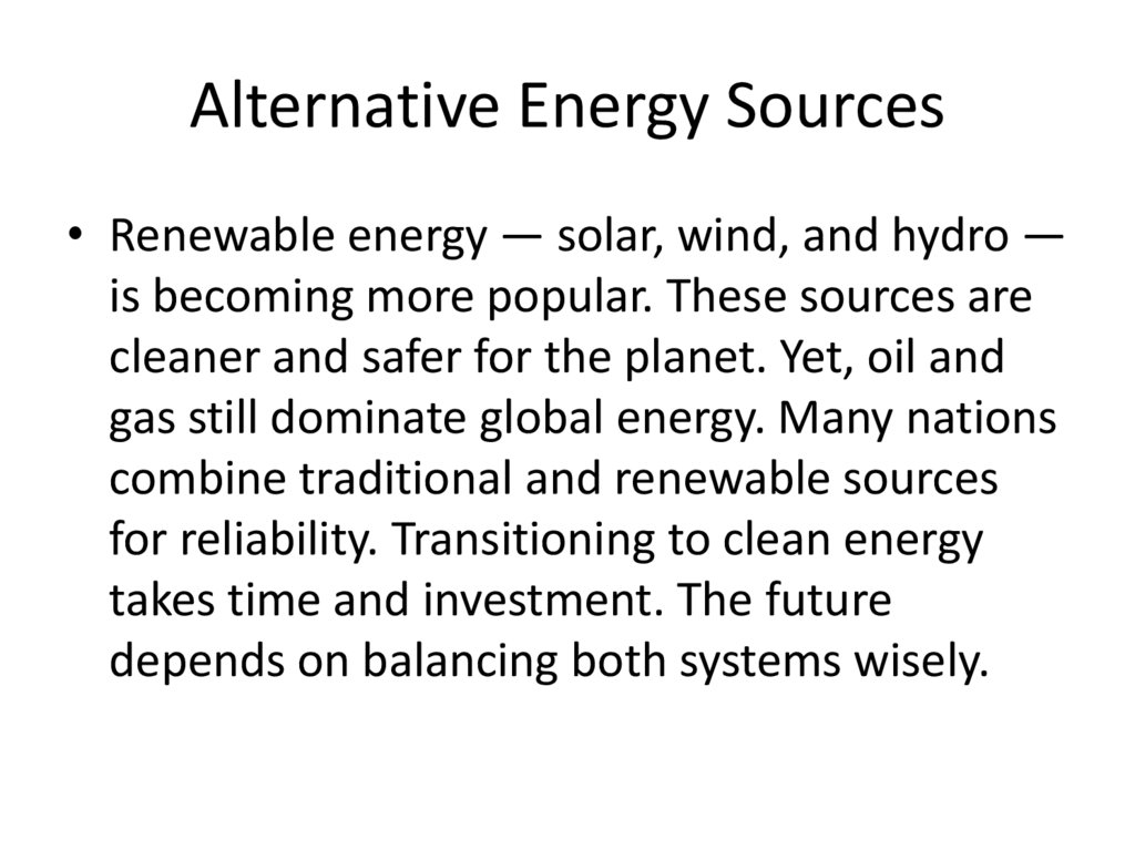 Alternative Energy Sources• Renewable energy — solar, wind, and hydro —
