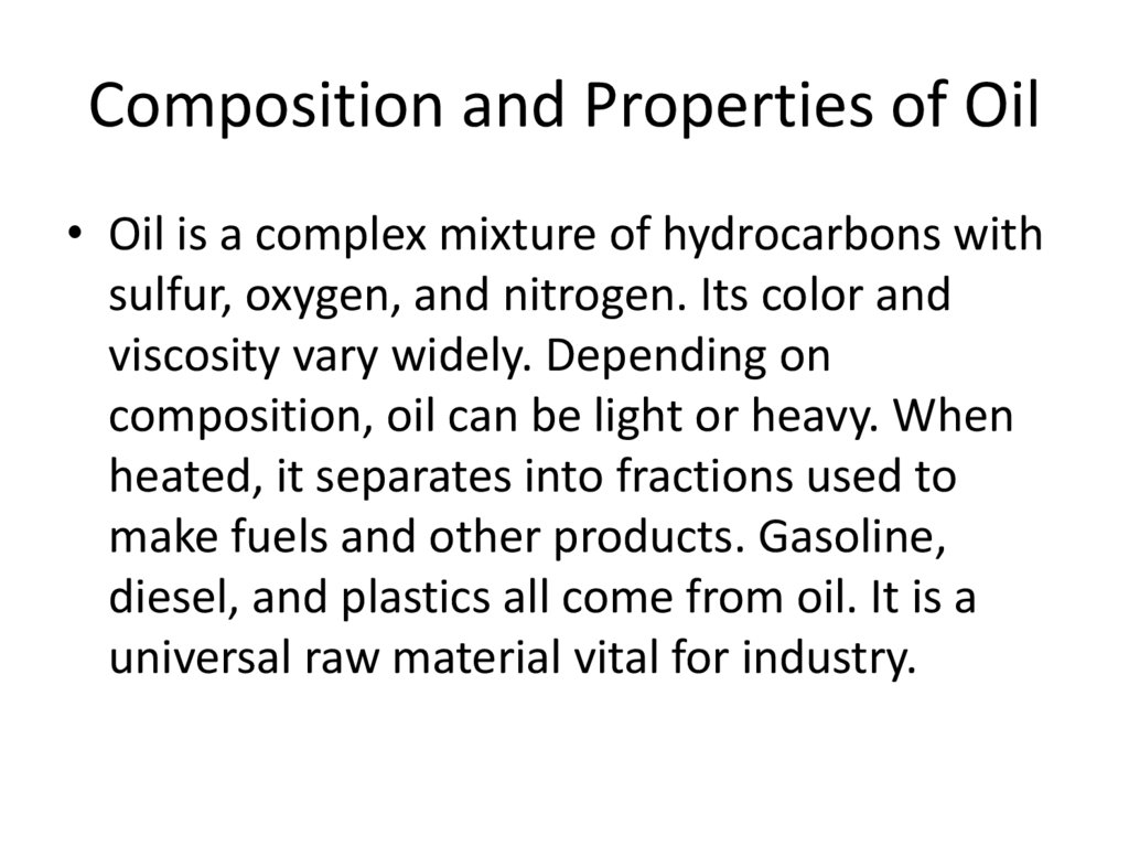 Composition and Properties of Oil• Oil is a complex mixture of hydrocarbons with
