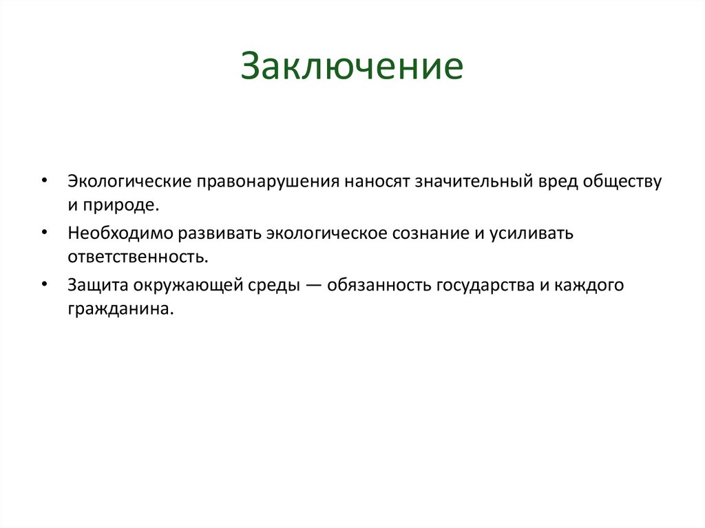 Заключение• Экологические правонарушения наносят значительный вред обществу