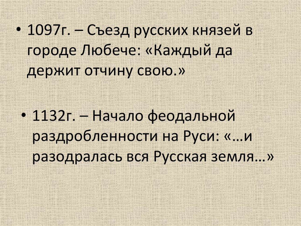 • 1097г. – Съезд русских князей вгороде Любече: «Каждый да